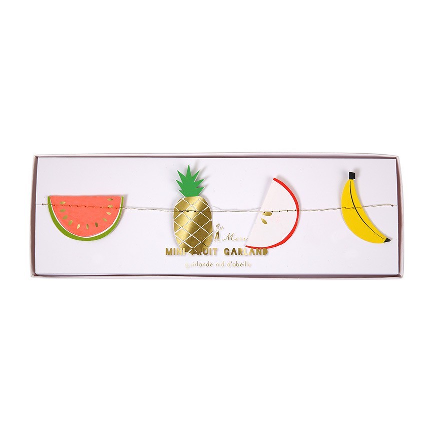 Decorate your celebration with lots of color with this fruity mini-garland, perfect for a summer celebration. The garland comes with lots of fruit themed pennants embellished with shiny gold foil and suspended on metallic twine. Meri Meri Pack contains 1 mini-garland of 56 fruits Garland length: 4 m