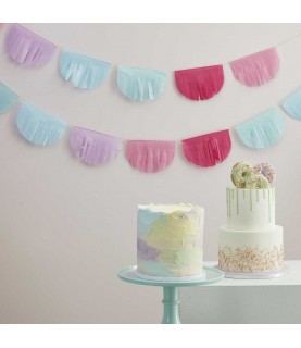 Bring your party to life with our pastel pink, purple and blue fringed semi cercle garland. A great party decoration to accessorise any party venue and sure to put a smile on your guests faces!