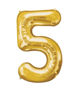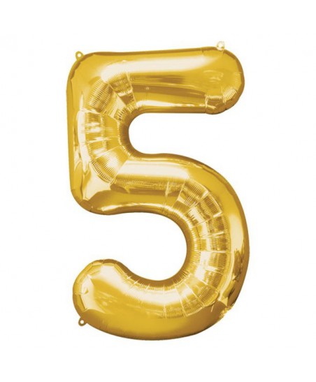 Golden "Super Shape" metallic Mylar balloon that will decorate and indicate with style the number 5!