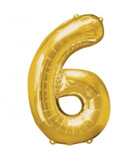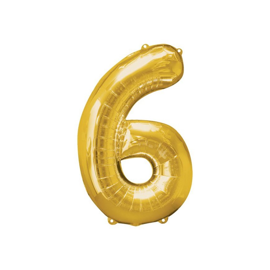 Golden "Super Shape" metallic Mylar balloon that will decorate and indicate with style the number 6!