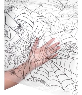 This clear plastic spider web printed tablecover will make your table spooky for your halloween party. Made of clear printed plastic, it will look best when layered over a solid color tablecover for an eerie effect!