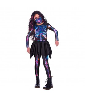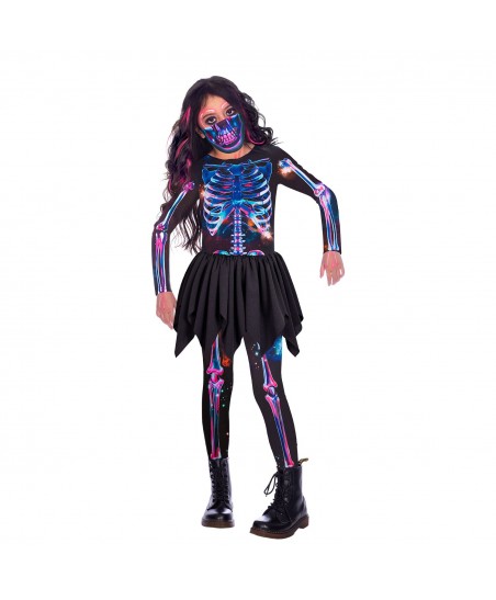This stylish skeleton fancy dress features a jumpsuit and mouth mask with a printed neon design that make this otherwise classic Halloween costume unique.