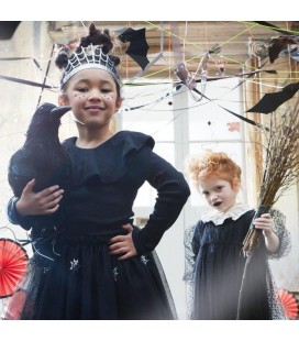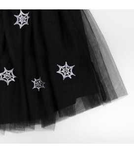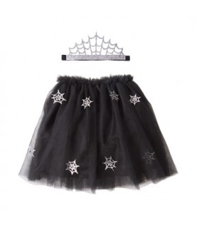 This Meri Meri tutu and tiara kit is a spectacular outfit to wear for Halloween. The gorgeous lined net skirt has sparkly cobweb details and the glittery tiara is perfect to look eerily glamorous. The lined black net skirt has gorgeous glitter cobweb details