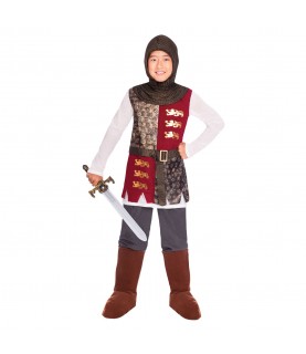 Dress as a valiant knight in this great fancy dress costume. You'll look like one of King Arthur's knights about to go on an adventure! Or a fairy tale knight looking for a quest. The costume consists of a tunic embossed with lions, a chainmail effect belt and headpiece, trousers with attached boot covers as well as a toy sword to complete the look.