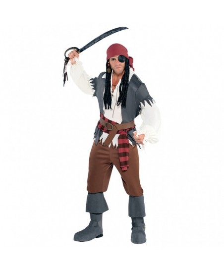 Our Pirate Costume for men is featuring a white V-neck shirt with traditional puffy sleeves and an attached faux leather vest, this weatherworn-looking costume is perfect for finding pirate's booty. Pull on the elastic-waist brown pants and complete your Castaway Captain Pirate Costume with the headscarf, striped waist sash and brown belt.