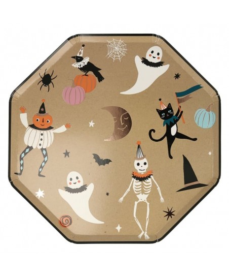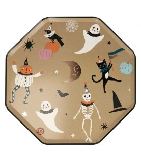 These wonderful octagonal Halloween plates have illustrations of iconic creepy charters, including ghosts, a black cat, bats, spiders, pumpkin and crow. They will look terrific on your party table, and will definitely thrill your guests. The plates feature copper foil detail for a shiny effect.