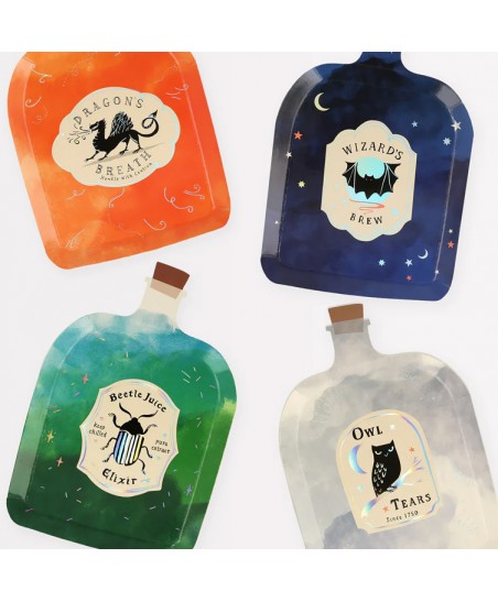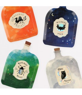 Brew up a magical party with these special plates cleverly crafted to look just like potion bottles. They will definitely cast a spell on your party guests. Plates have never been this enchanting before! They are perfect for witch or wizard parties, Halloween or an enchanted evening. They will look terrific on your party table, and will definitely thrill your guests. The plates feature holographic foil detail for a shiny effect.