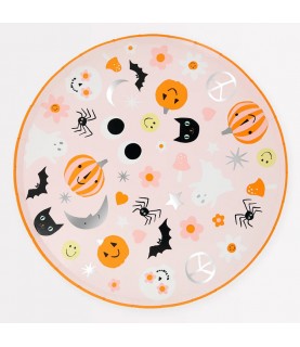 These amazing plates will put your Halloween party guests in a groovy mood! They feature fantastic Halloween icons to make you and your guests smile! The color combination of pink, orange, black, silver, and white teamed with flowers and peace signs will make your party pop with style for a total groovy look! Groove is in the heart and in Halloween!