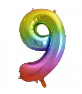 Rainbow "Super Shape" metallic foil balloon that will decorate and indicate with style the number 9 !