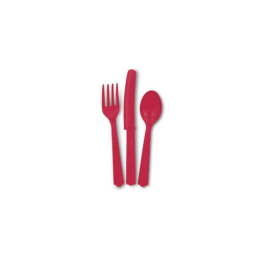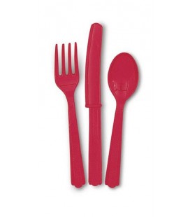 Each package contains 18 red plastic cutlery: 6 forks, 6 spoons and 6 knives.