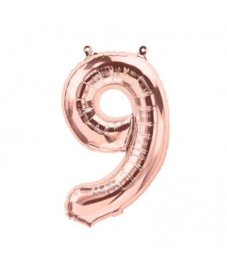 Rose Gold  "Super Shape" metallic Mylar balloon that will decorate and indicate with style the number 9!