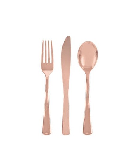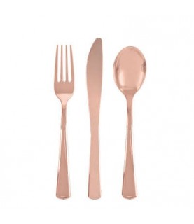 Each package contains 18 rose gold plastic cutlery: 6 forks, 6 spoons and 6 knives. They will add a glamorous and elegant touch to all your events!