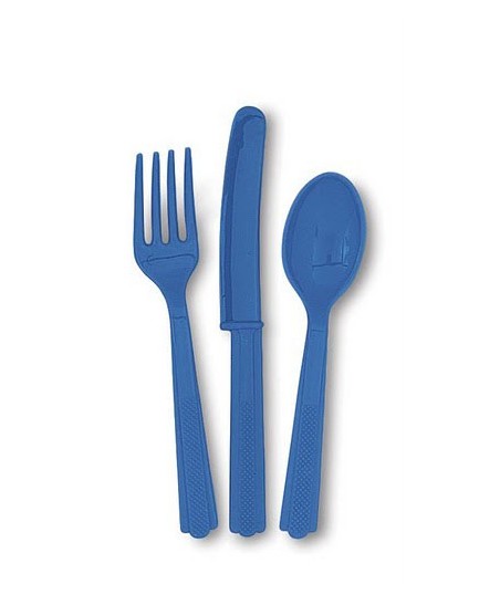 Each package contains 18 royal blue plastic cutlery: 6 forks, 6 spoons and 6 knives.