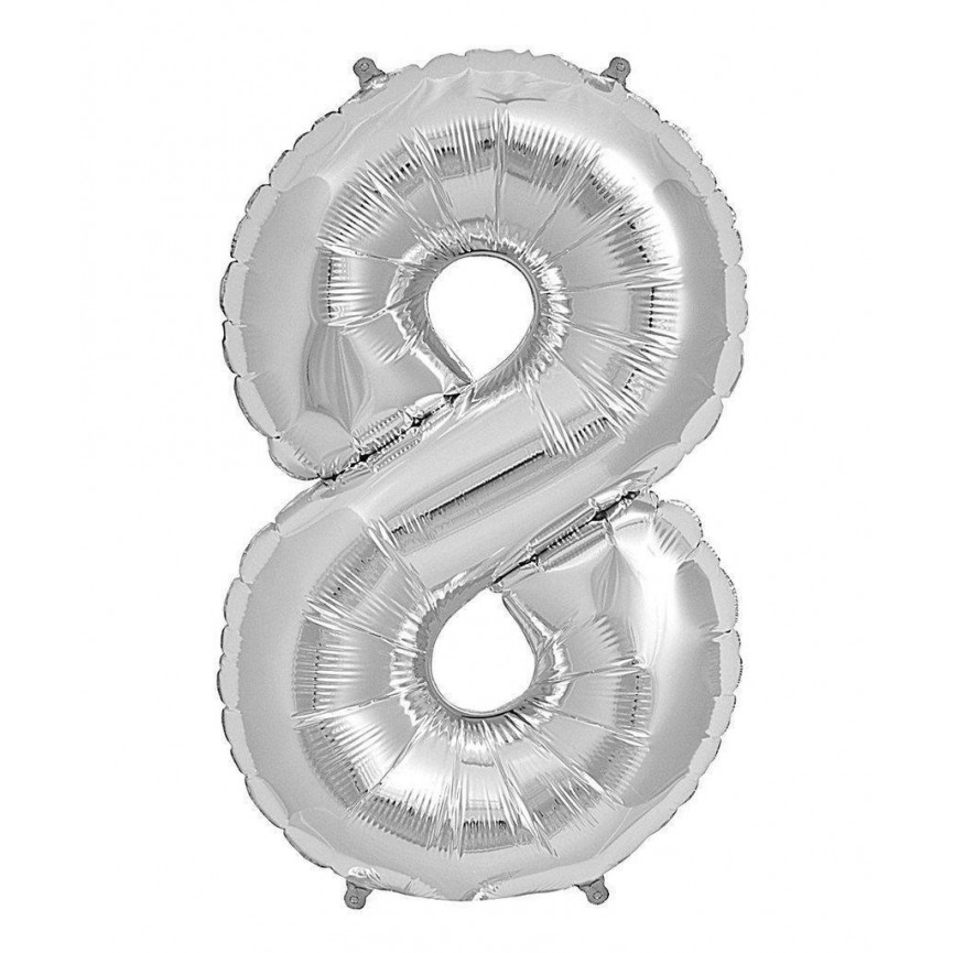 Silver "Super Shape" metallic foil balloon that will decorate and indicate with style the number 8!