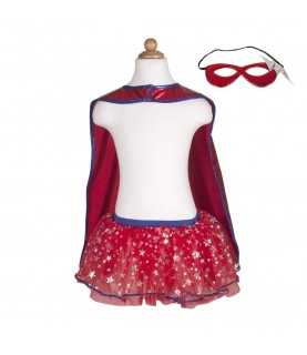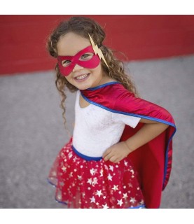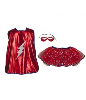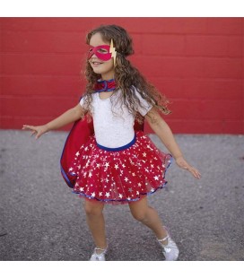 Save the day and be your own superhero with this amazing cape-tutu set with matching mask. The lighting bright red tutu features a silver star pattern and is trimmed in blue sequins. The matching cape is bound in blue shine and features a matching lighting bolt to the soft for an easy-on-and-off. A superhero mask completes the look so you can save the day incognito!
