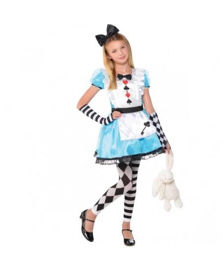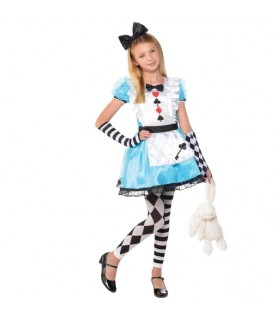 This beautiful disguise of Alice in Wonderland includes a sky blue dress with puff sleeves, the top with frills and the bottom of an apron. Black and white legging, matching cuffs and a black bow tie headband complete this refined costume.