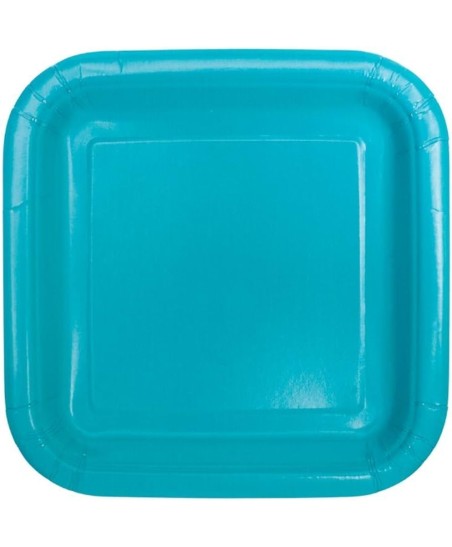 Each package contains 16 turquoise square paper plates.