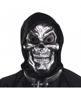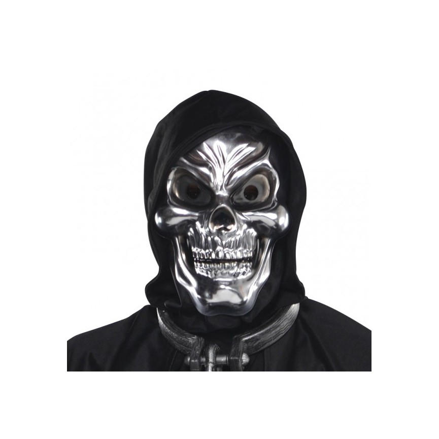Notre masque de tête de mort couleur argent dispose d'un crâne avec des pommettes exagérées, d'un menton ciselé, des yeux noirs grand ouverts, et il montre les dents. Les yeux sont grands ouverts pour un look fou et monstrueux. Le masque est fait en plastique léger et dispose d'un fil élastique.