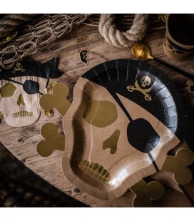 Ces serviettes en forme de tête de mort en or brillant avec des os croisés, complétées par des cache-oeils, sont parfaites pour servir un délicieux festin à vos petits pirates.