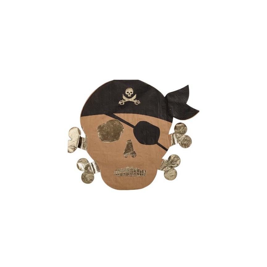 Ces serviettes en forme de tête de mort en or brillant avec des os croisés, complétées par des cache-oeils, sont parfaites pour servir un délicieux festin à vos petits pirates.