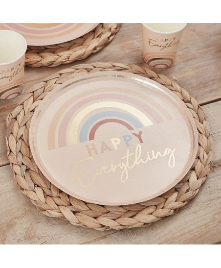 Ces jolies assiettes avec un élégant arc-en-ciel et l'inscription dorée métallisée "Happy Everything" sont hyper tendance. Elles sublimeront et illumineront votre table en délicatesse tout en ajoutant une touche chic et moderne à votre fête!