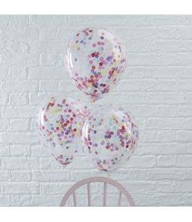 Ces 5 ballons transparents remplis de confettis apporteront une touche d'originalité à vos fêtes tout en douceur et en légèreté! Une belle et ludique idée pour décorer l’anniversaire des enfants et pour les plus téméraires, à la fin de la fête, on explose les ballons pour voir tomber une pluie de confettis! Facile d'utilisation, il vous suffit de les gonfler à l'air ou à l'hélium suivant l'effet que vous souhaitez donner à votre ballon. Quand les ballons sont gonflés à l'air, les confettis se collent contre la paroi, si les ballons sont gonflés à l'hélium les confettis s'amoncellent dans le bas du ballon. Petite astuce : frottez les ballons contre vos vêtements pour créer de l’électricité statique : ainsi les confettis se colleront bien aux parois. Une déco simple et tendance pour un effet fou!