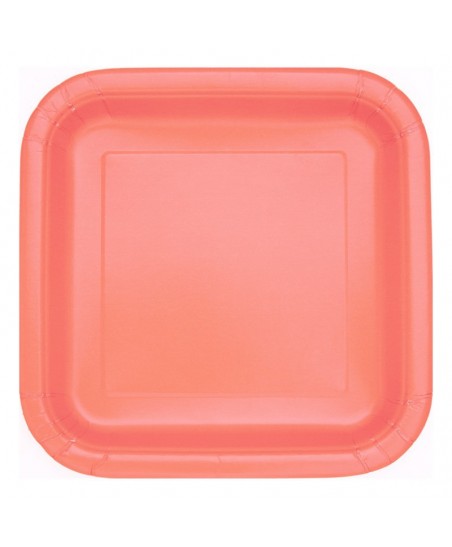 Chaque paquet comprend 14 assiettes carrées en carton de couleur corail.