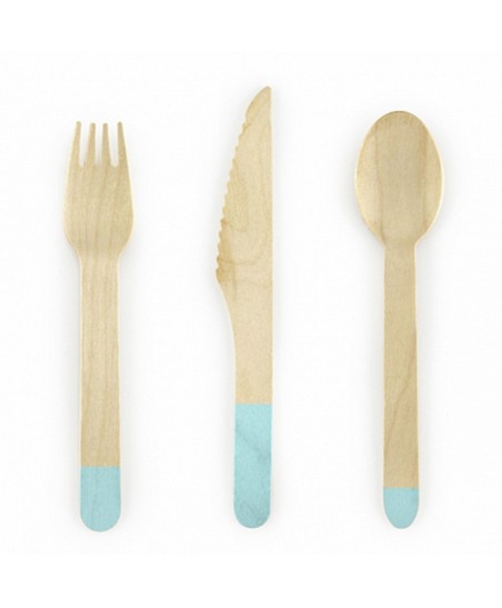 Lot de 18 pièces de couverts en bois. Ces couverts sont parfaits pour décorer un candy-bar ou une jolie sweet table et ajouter une touche rétro et colorée à vos fêtes et gourmandises !