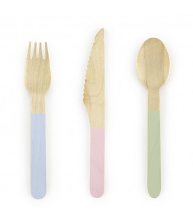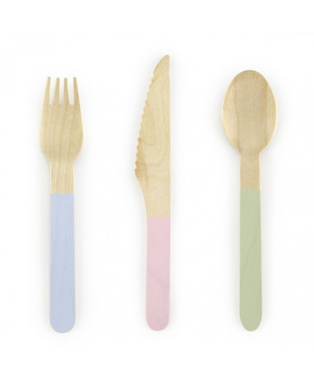 Lot de 18 pièces de couverts en bois. Ces couverts sont parfaits pour décorer un candy-bar ou une jolie sweet table et ajouter une touche rétro et colorée à vos fêtes et gourmandises !