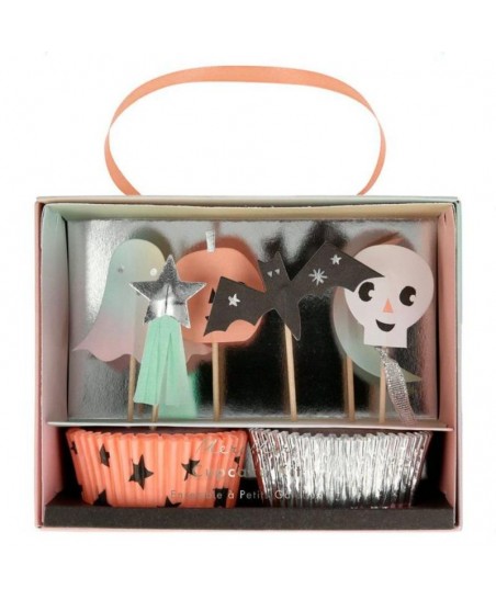 Ce kit de cupcake comprend 6 modèle de toppers (décorations) avec 4 modèles de chaque : crâne, chauve-souris, étoile, citrouille, fantôme et croissant de lune. Il contient également 24 étuis de cupcake en 2 modèles: 12 en feuille d'argent et 12 en couleur corail avec des étoiles noires. Il est parfait pour créer les friandises d'Halloween les plus étonnantes!