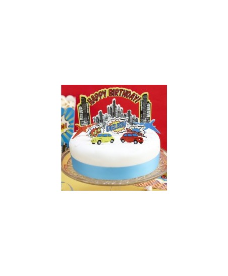 Ce kit contient 11 décorations de gâteaux en forme de voitures, avions et bâtiments avec une bannière Happy Birthday. Sans glaçage, il suffit juste de poser la décoration sur le gâteau ! Super pour une fête d'anniversaire d'un Super Héro !