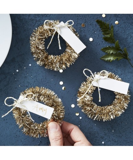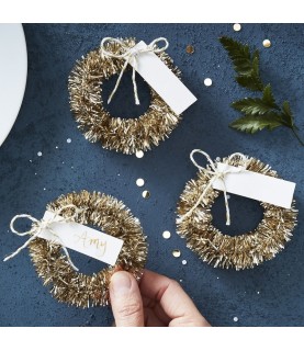 Dressez une table stylée pour Noël avec ces mini-couronnes dorées scintillantes dotées d'une carte de placement. Un excellent moyen de vous assurer que vos invités sont assis à l'endroit idéal autour de votre table!