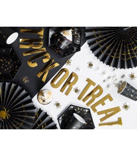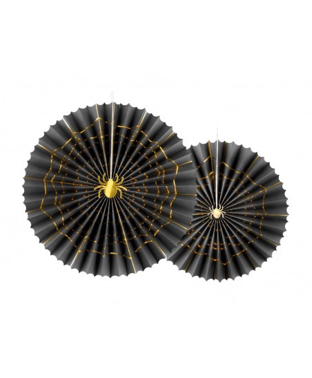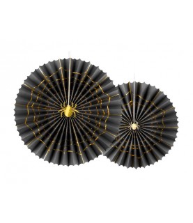 Deux rosaces de dimensions différentes. Elles sont noires et ornées avec une araignée au centre et tout autour des fils dorés pour composer la toile d'araignée. Ces jolies rosaces suspendues à des hauteurs différentes ou accrochées à votre buffet feront une superbe décoration Halloween!