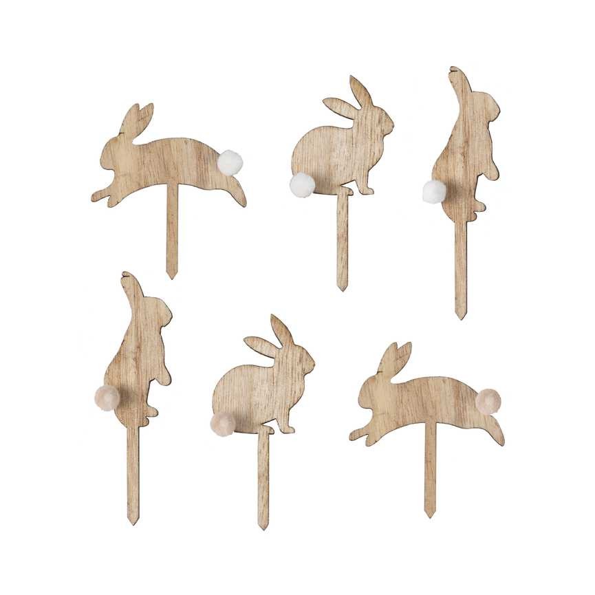 Un ensemble de jolis cupcake toppers en bois en forme de lapin avec un pompon en guise de queue. Ils ajouteront une touche délicate et rigolote à votre table.