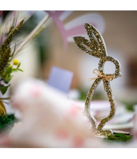 Ce mignon lapin doré pailleté s'invite dans votre maison! Il n'y a pas de Pâques sans lapin. Celui-ci orné de paillettes dorées, d'un noeud en raphia est placé sur un socle en bois pour plus de stabilité. Il embellira votre décoration et ajoutera une touche douce et stylée à votre table qui séduira et ravira tous vos invités.