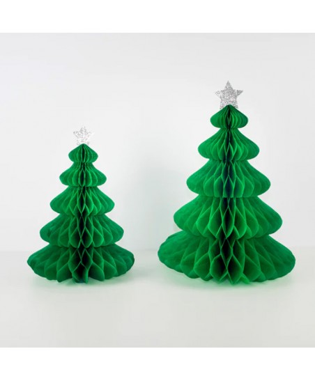 Ces décorations en forme de sapin de Noël en papier nid d'abeille auront fière allure pour votre déco de fêtes. Le pack comprend 2 magnifiques sapins de tailles différentes embellis d'une petite étoile pailletée pour un effet 3D vraiment stylé!