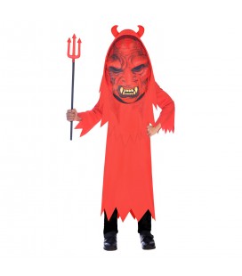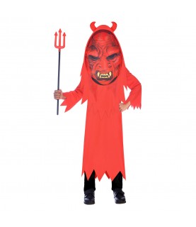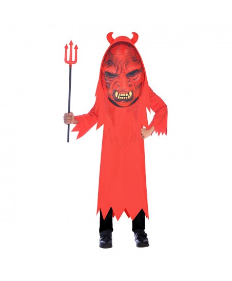Notre costume comprend cette robe rouge avec un ourlet dentelé et avec des manches assorties, costume completé d'un masque grosse tête surdimensionné avec capuche et cornes de diable.