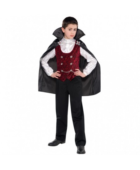 Notre déguisement Dark Vampire est composé d'une chemise blanche façon soie à manches longues, y est attaché un gilet rouge à dessin brocart avec des boutons et une chaîne couleur argent. La cape noire à col montant a des médaillons et une chaînette devant. Libre à toi de choisir ton pantalon pour créer ton propre look !