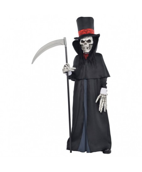 Notre costume de " Moissonneur de la mort à la mode" comporte un chapeau surdimensionné avec une bande damassé rouge et une cravate Ascot satinée qui vont parfaitement avec le grand col debout. Avec de longues boucles rasta noires, le chapeau deux-en-un facilite une apparence impeccable! Une cape jusqu'au sol avec un col exagéré défend contre tout et aide à donner une silhouette effrayante. Le masque de crâne d'horreur en plastique qui tient avec une sangle élastique complète cette tenue.