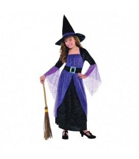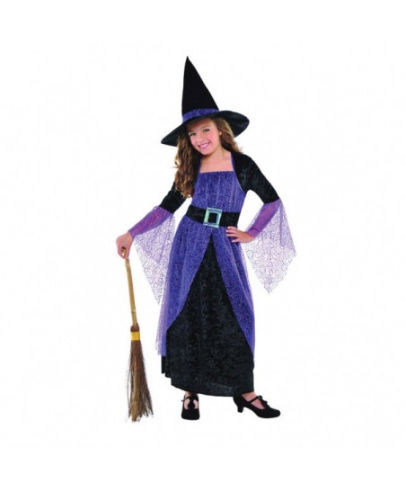 Un breuvage vraiment magique, ce déguisement ! Il se compose d'une robe en velours noir d'une longueur jusqu'à la cheville, recouverte d'un voile violet avec des tourbillons brillants. Les manches sont également en voile violet, et la robe dispose d’une ceinture attachée avec une boucle en tissu irisé. Le top de ce joli costume de sorcière est le chapeau de velours noir assorti !