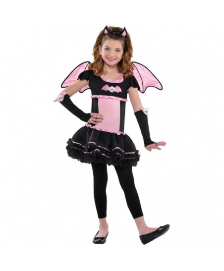 Ce costume Chauve-souris 'Bat to the Bone' comprend une jolie robe rose et noire avec une tête de mort sur le devant (la jupe est un tutu à froufrous noir), des ailes roses détachables, des gants longs sans doigts de couleur noire avec des têtes de mort, et un bandeau assorti avec des oreilles de chauve-souris. Les leggings noirs sont la touche finale à ce costume.