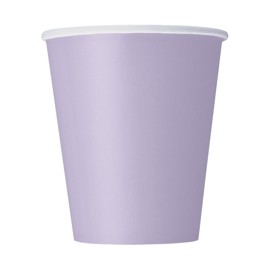Chaque paquet comprend 14 gobelets en carton de couleur lavande.