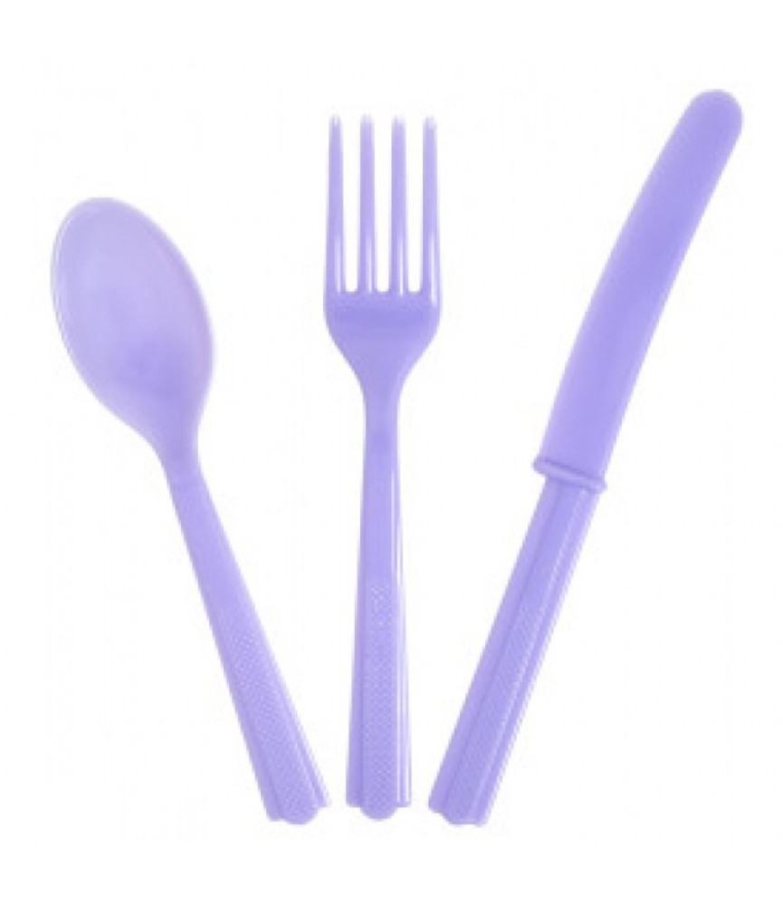Chaque paquet comprend 18 pièces de couverts en plastique de couleur lavande, soit 6 cuillères, 6 fourchettes et 6 couteaux.