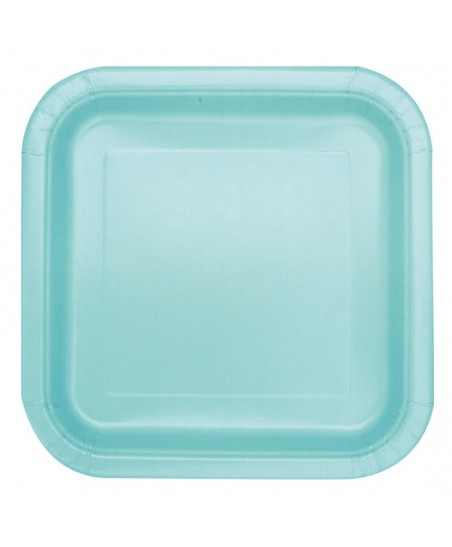 Chaque paquet comprend 14 petites assiettes carrées en carton de couleur menthe.
