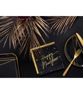 20 grandes serviettes en papier noir avec un imprimé métallisé doré et les mots "Happy New Year". Ces serviettes sont parfaites pour une table du Nouvel An !