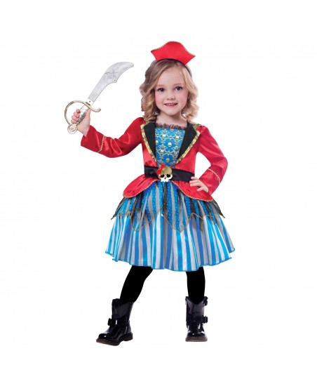 Naviguez en haute mer avec ce costume de pirate adorable! La robe  comporte un haut bleu avec des crânes dorés, et la jupe est rayée bleu et blanc. La veste rouge comporte des revers rouges et noirs et une ceinture noire élégante avec un crâne doré au centre. Terminez ce look avec le chapeau de capitaine rouge !