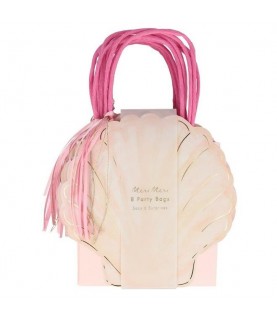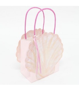 Vos invités seront ravis de recevoir ces magnifiques sacs à cadeaux que vous pourrez remplir de fabuleuses friandises ou de petits jouets. Ils présentent un beau design de coquille avec du papier scintillant sur le devant et le dos du sac, ainsi qu'un superbe gland, fait de rubans de satin rose et de fil métallique doré.