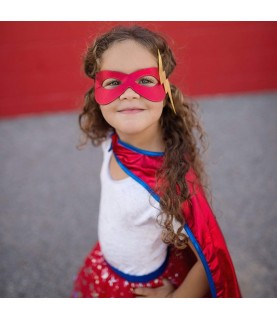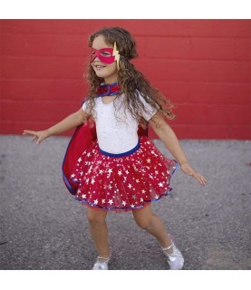 Sauvez la journée et soyez votre propre super héros avec cet incroyable ensemble cape, tutu et masque. Le tutu rouge lumineux est parsemé d'étoiles argentées et embelli d'un liseré de paillettes bleues. La cape assortie est ornée d'un étincelant éclair avec une fermeture Velcro au niveau du cou qui rend la cape facile à mettre et à enlever. Un masque complète le look pour rester incognito pendant vos missions!