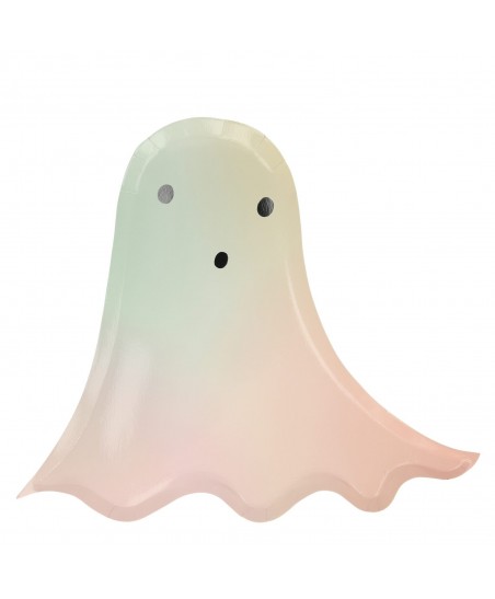 Ces jolies assiettes fantômes ajouteront une touche de couleur à votre table de fête d'Halloween. Elles présentent un motif pastel ombré menthe, pêche et rose, et les yeux et la bouche sont faits de feuille d'argent scintillante. Ces assiettes sont également superbes comme décorations!