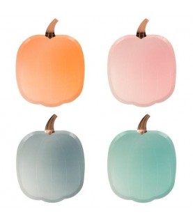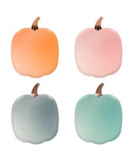 Ces assiettes citrouilles, dans 4 teintes ombrées (orange, rose, menthe et bleu), avec des tiges en feuille or brillant, auront fière allure dans le cadre de votre vaisselle de fête d'Halloween. Un moyen facile d'ajouter de la couleur et du style à vos célébrations effrayantes !